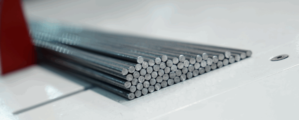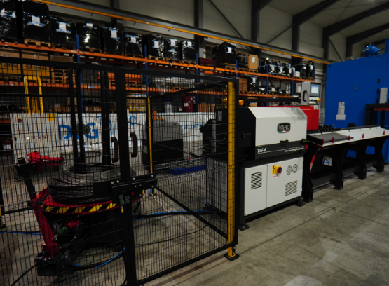 - automatycznym podawaniem drutu: drut stalowy podawany jest automatycznie z kręgu, prostowany i cięty na odpowiednie odcinki, a następnie precyzyjnie pozycjonowany w strefie zgrzewania. Taki układ zapewnia pełną kontrolę nad rozstawem prętów i wysoką powtarzalność każdego panelu.