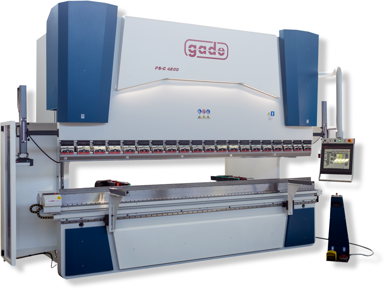 Nowoczesne sterowniki CNC z graficznym, dotykowym panelem gwarantują szybką konfigurację programów gięcia i pełną kontrolę nad procesem. Prasy GADE oferują automatyczną kompensację ugięcia stołu, precyzyjną synchronizację osi oraz integrację z systemami pomiaru kąta (np. FasterMade). Dodatkowe opcje, takie jak automatyczny magazyn narzędzi Changemade czy integracja z robotem, pozwalają w pełni zautomatyzować proces gięcia blach nawet w produkcji wielkoseryjnej.