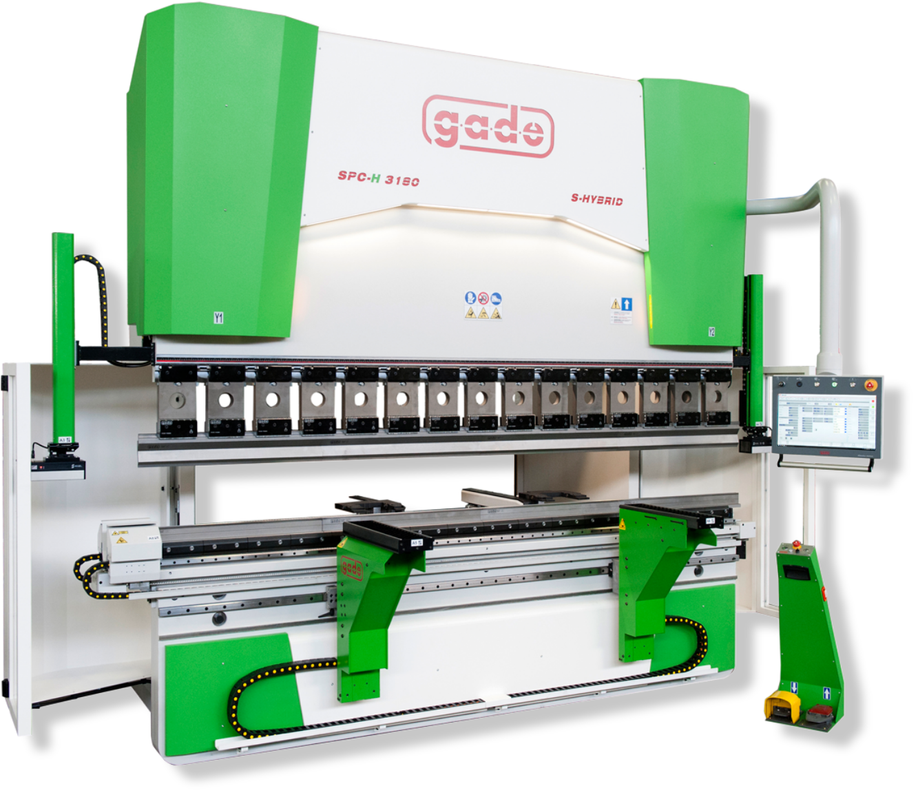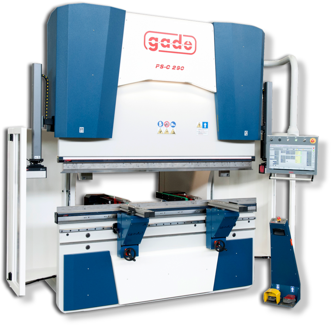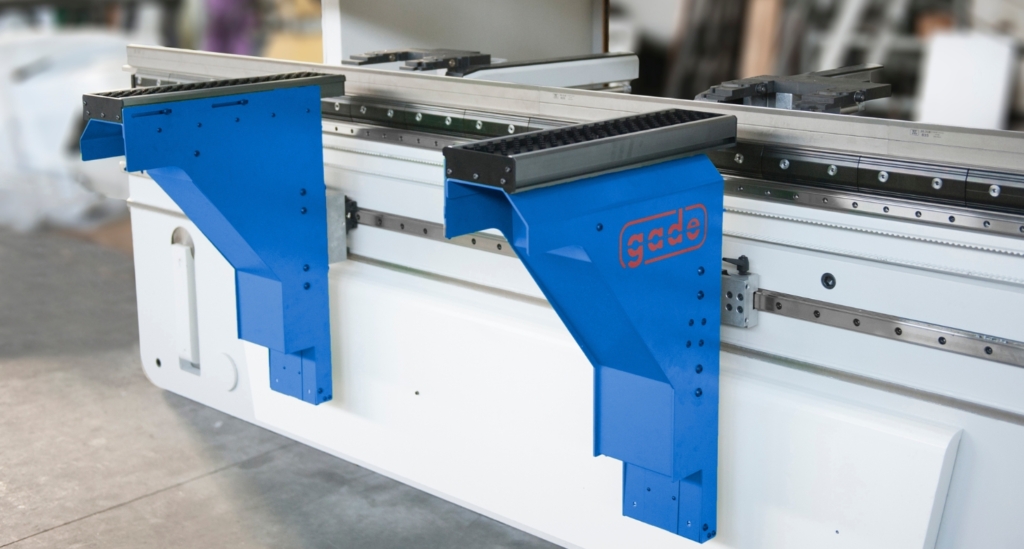 Każda prasa krawędziowa GADE wyposażona jest w systemy chroniące życie i zdrowie operatorów – kurtyny świetlne z przodu, barierę fotokomórkową z tyłu czy laserowy system zabezpieczeń w strefie pracy. Przednie podpory blachy, przesuwane na prowadnicach kulkowych lub podpory nadążne, ułatwiają obsługę nawet największych formatów. Maszyny można wyposażyć też w listwy do podświetlenia linii gięcia, ergonomiczne pulpity CNC oraz funkcje automatycznego pozycjonowania osłon oraz podpór.