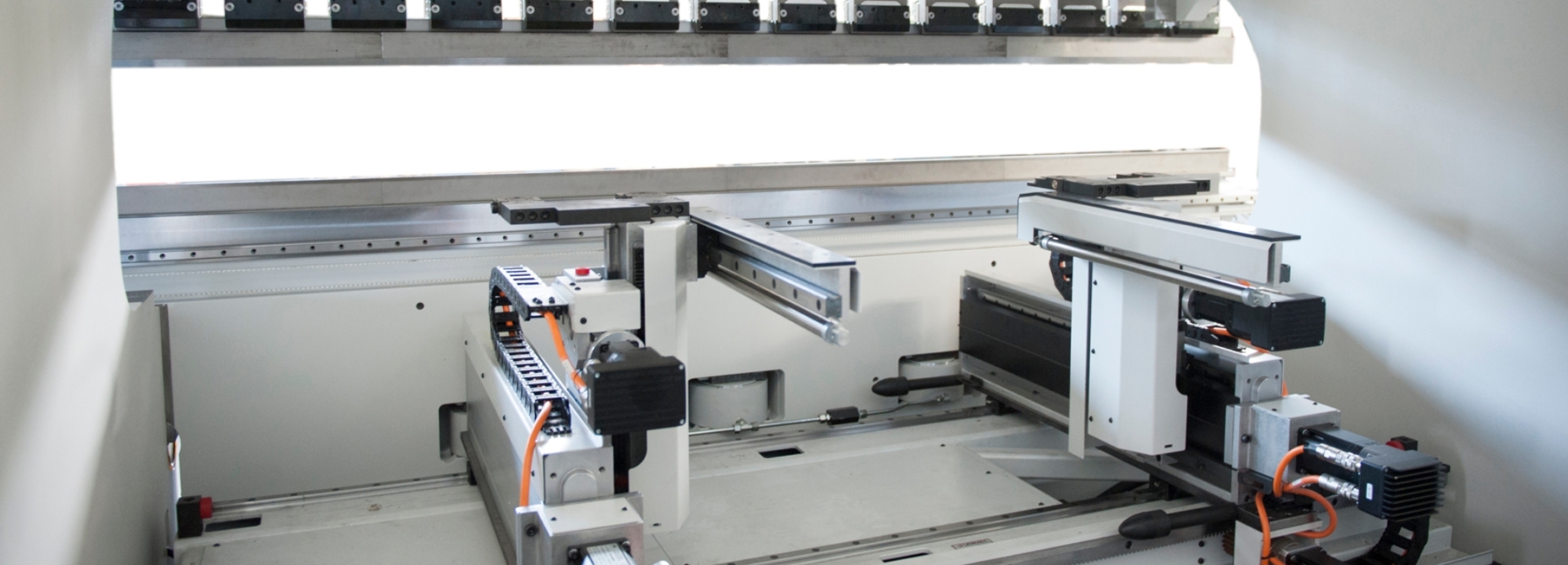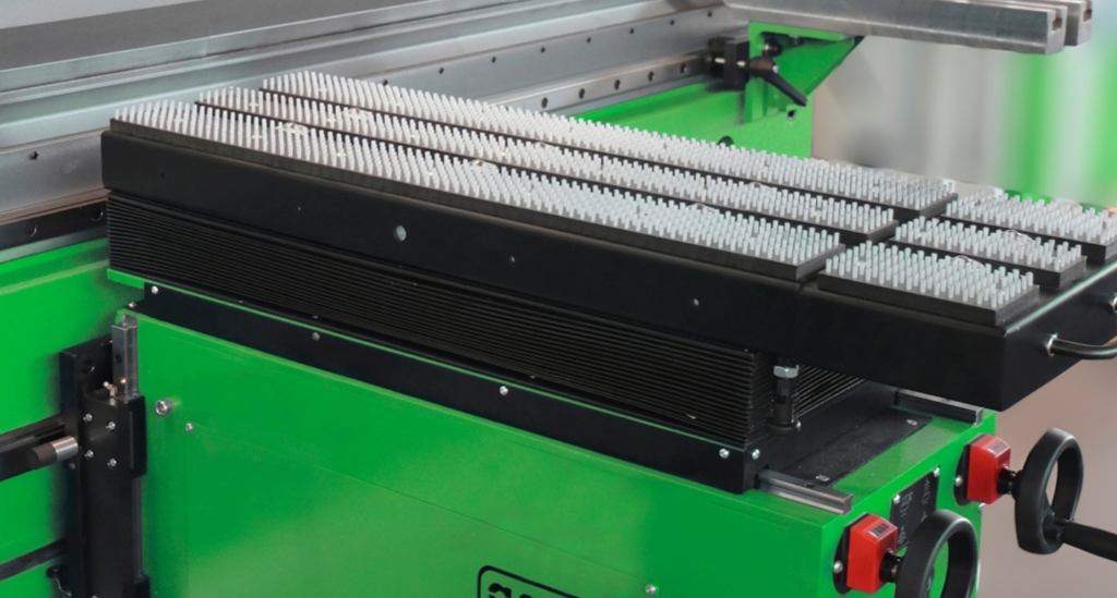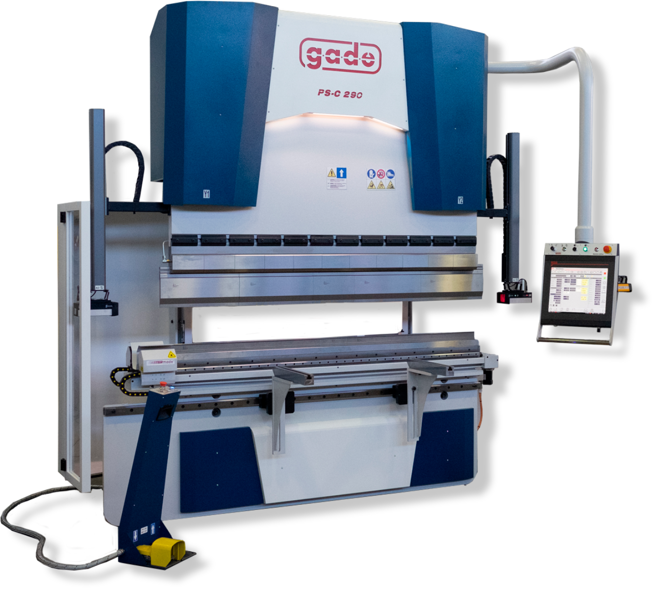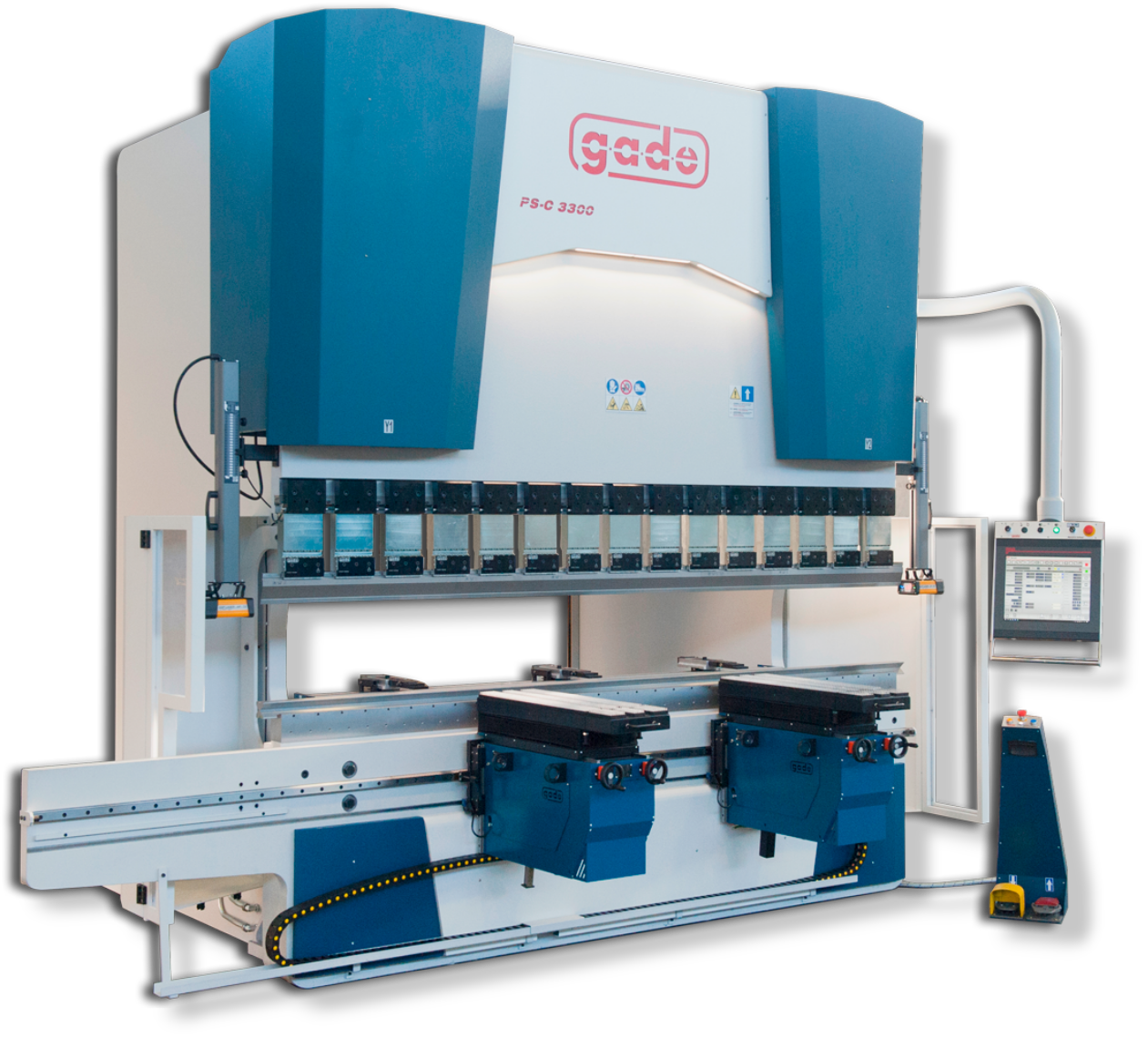 Każda prasa krawędziowa GADE wyposażona jest w systemy chroniące życie i zdrowie operatorów – kurtyny świetlne z przodu, barierę fotokomórkową z tyłu czy laserowy system zabezpieczeń w strefie pracy. Przednie podpory blachy, przesuwane na prowadnicach kulkowych lub podpory nadążne, ułatwiają obsługę nawet największych formatów. Maszyny można wyposażyć też w listwy do podświetlenia linii gięcia, ergonomiczne pulpity CNC oraz funkcje automatycznego pozycjonowania osłon oraz podpór.
