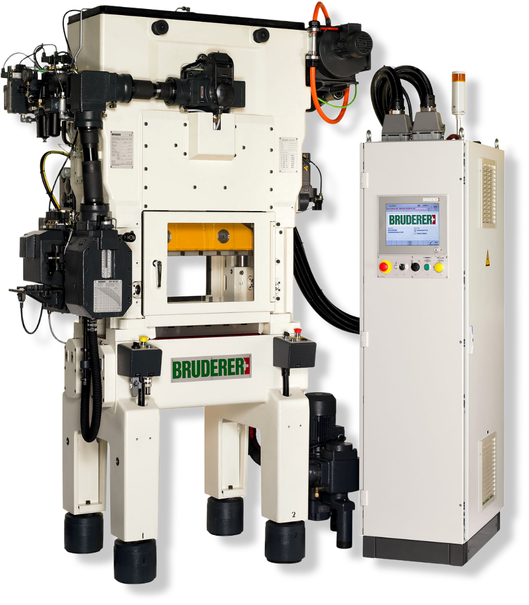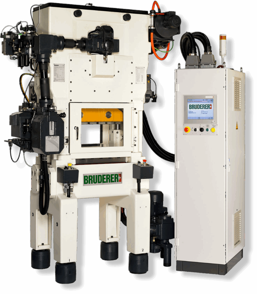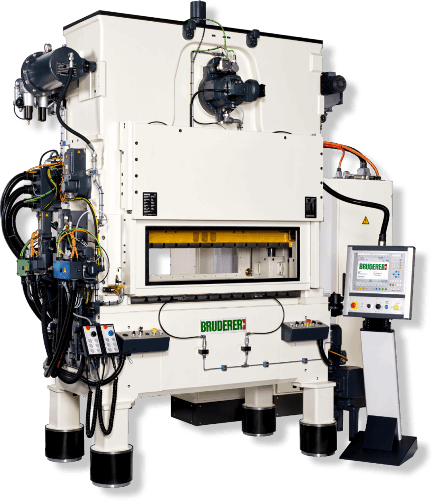 Prasy szybkobieżne Bruderer wyposażone są w unikalny system dźwigni oraz regulowany skok, co pozwala na szybkie i precyzyjne dopasowanie parametrów pracy do różnych detali. Zaawansowane sterowanie CNC zapewnia intuicyjną obsługę i łatwą konfigurację, a system równoważenia masy – stabilność oraz utrzymanie dokładnego położenia dolnego martwego punktu (BDC) przez cały cykl pracy. Dzięki temu prasy Bruderer są elastyczne i wydajne.