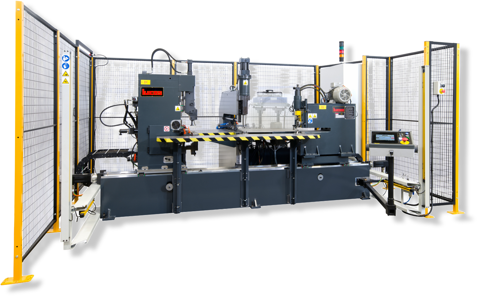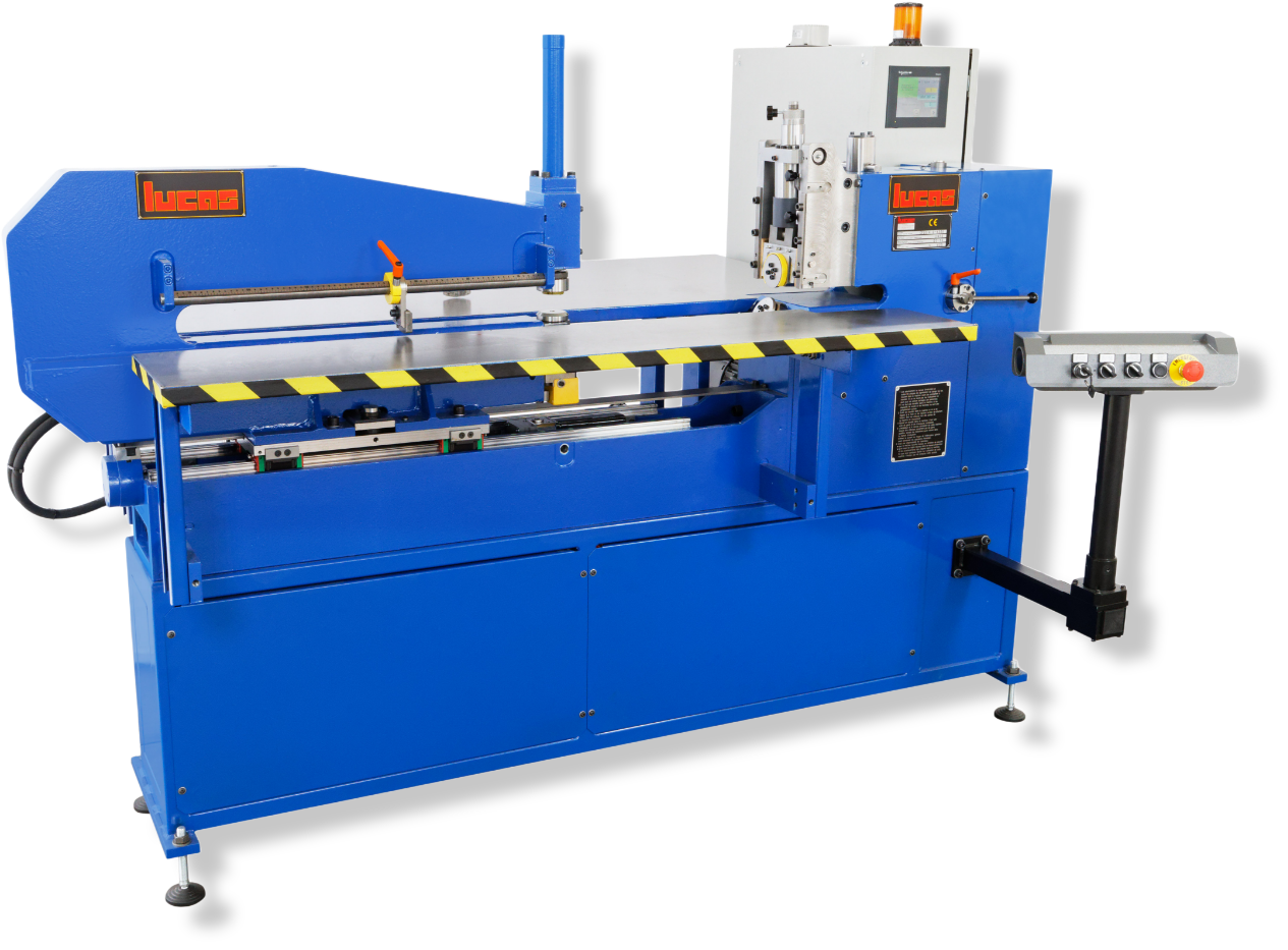 Wszystkie maszyny Lucas wyposażone są w systemy bezpieczeństwa – osłony, kurtyny świetlne, przyciski dwuręczne, blokady dostępu. Zapewnia to pełną ochronę operatora podczas pracy. Ergonomiczne rozmieszczenie paneli sterujących oraz szybka wymiana narzędzi skracają czasy przezbrojenia i zwiększają komfort użytkowania.