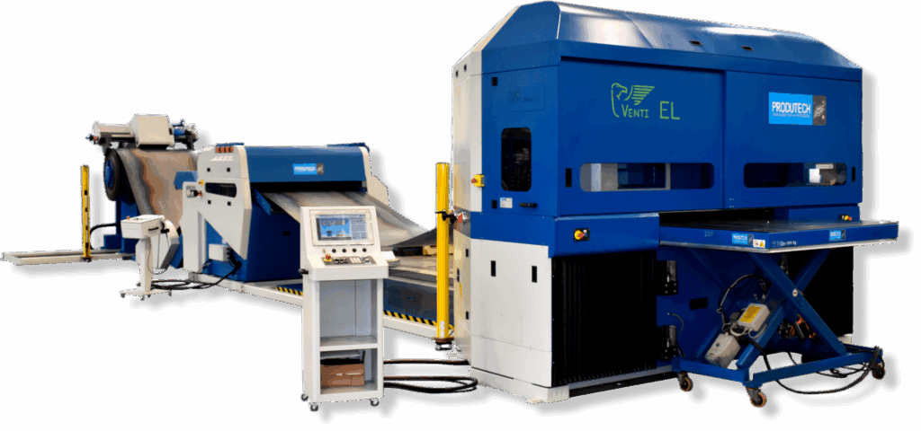 Wykrawarki młoteczkowe Produtech na bieżąco podają materiał z kręgu. Maszyna rozwija taśmę, pozycjonuje ją i wykonuje wykrawanie z użyciem indeksowanych narzędzi. Skraca to czas cyklu oraz eliminuje przerwy związane z załadunkiem arkuszy. Co więcej, zintegrowane systemy odbioru, sortowania i układania gotowych detali zmniejszają udział operatora i pozwalają na produkcję w trybie bezobsługowym – również w cyklach nocnych.